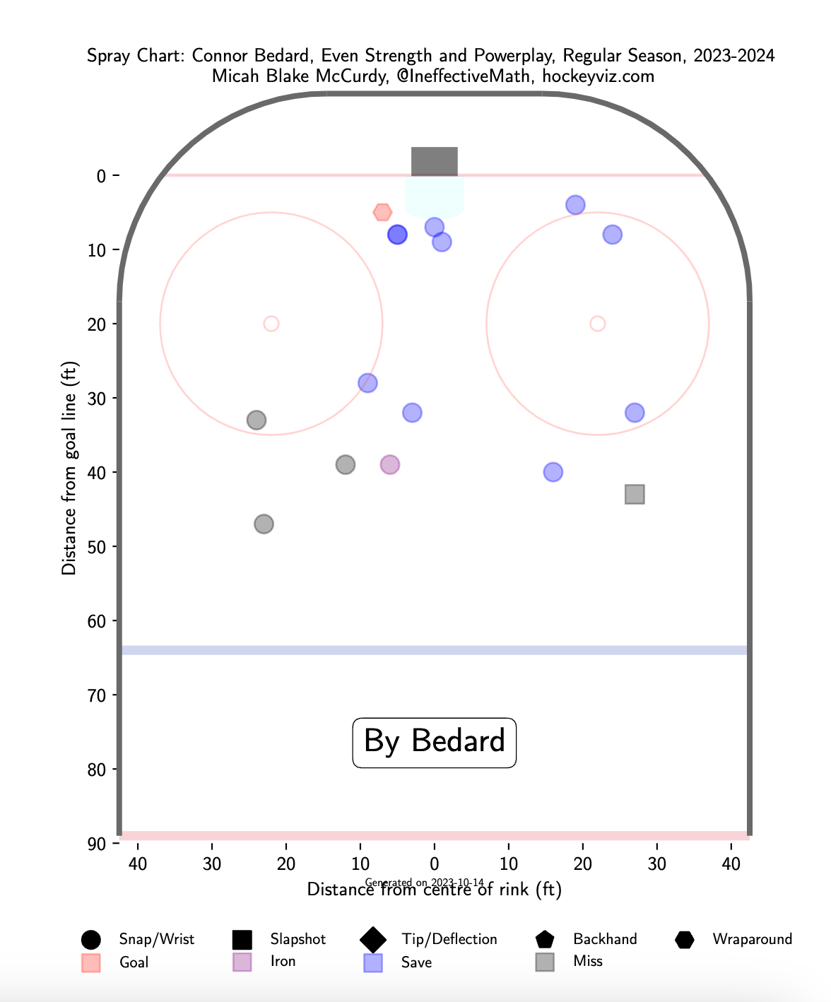 Most of Brady’s sheer ixG output came from the PP whack-a-puck he is now widely known for. There was at least some variety (and his 5v5 goal came on a nice shot from outside the dots), but let’s take a quick look at Bedard’s profile: