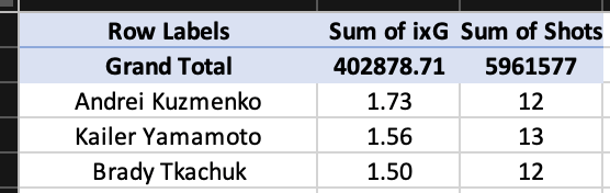 Sorting by ixG in the first two games, we get a couple other candidates to review in Bedard’s ballpark of 1.59 ixG.. Yamamoto we can cross out as cheating the games played system, as mentioned above.