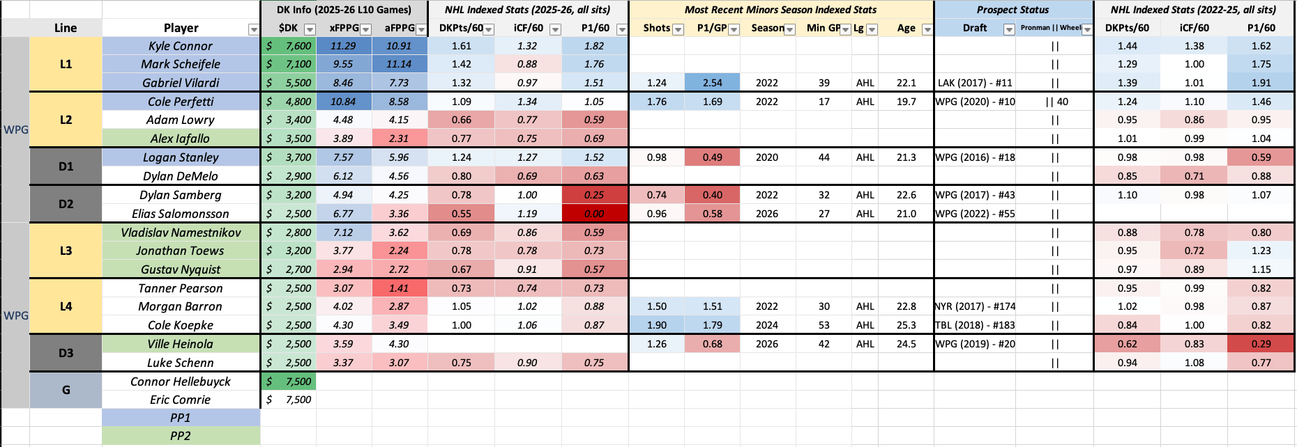 The middle six options for WPG are quite cheap, especially Namestnikov-Toews-Nyquist, but the reason for that is that they are terrible, and if the PP1 isn’t getting it done PP2 probably won’t either, especially now with Pionk not running the unit. Cole Perfetti is a fringe option, but 14 minutes, Adam Lowry-Alex Iafallo teammates, and a recent price hike to $4800 doesn't do it for me.