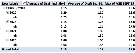 stats indexed by league and age, among NHL Drafted Prospects (above 1 = better than the average, 2 would be “twice as good” rates)