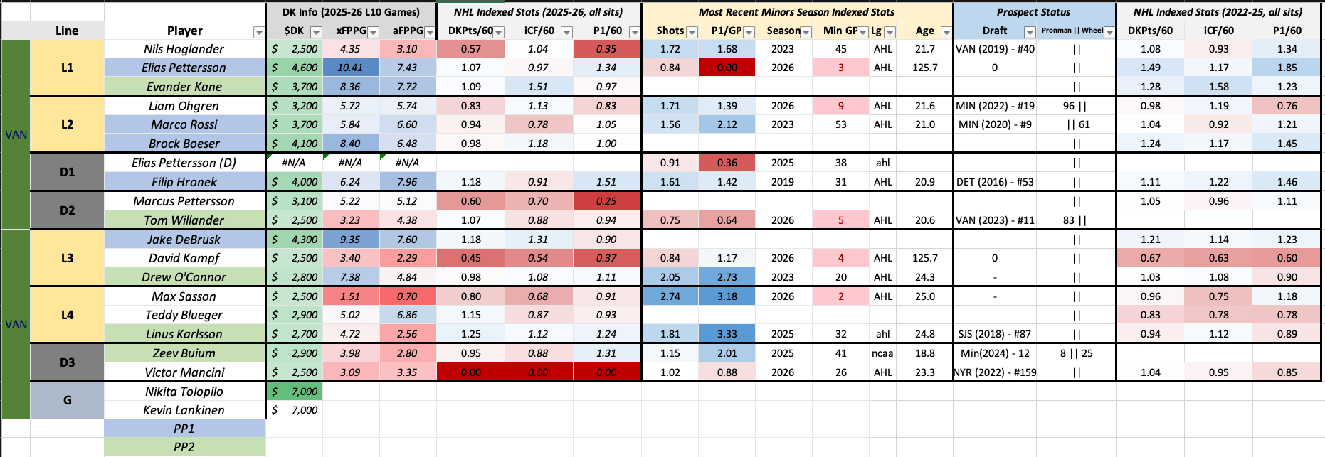 Fortunately for us, they are also getting progressively cheaper. If Liam Ohgren can step into the vacated PP role left by Garland, Ohgren-Rossi-Boeser could be $11000 with firm PP roles and great fantasy profiles in a matchup against the Blackhawks who just lost Jason Dickinson. This 6.5 total is pretty revealing, and I think both sides of this game offer up very interesting, cheap, pieces. EP40 is $4600 and no one is gonna play him! He has 6 primary assists in the last ten games, 7 in total, and his top line wing in Nils Hoglander is the dead minimum. There’s plenty of value here to consider.
