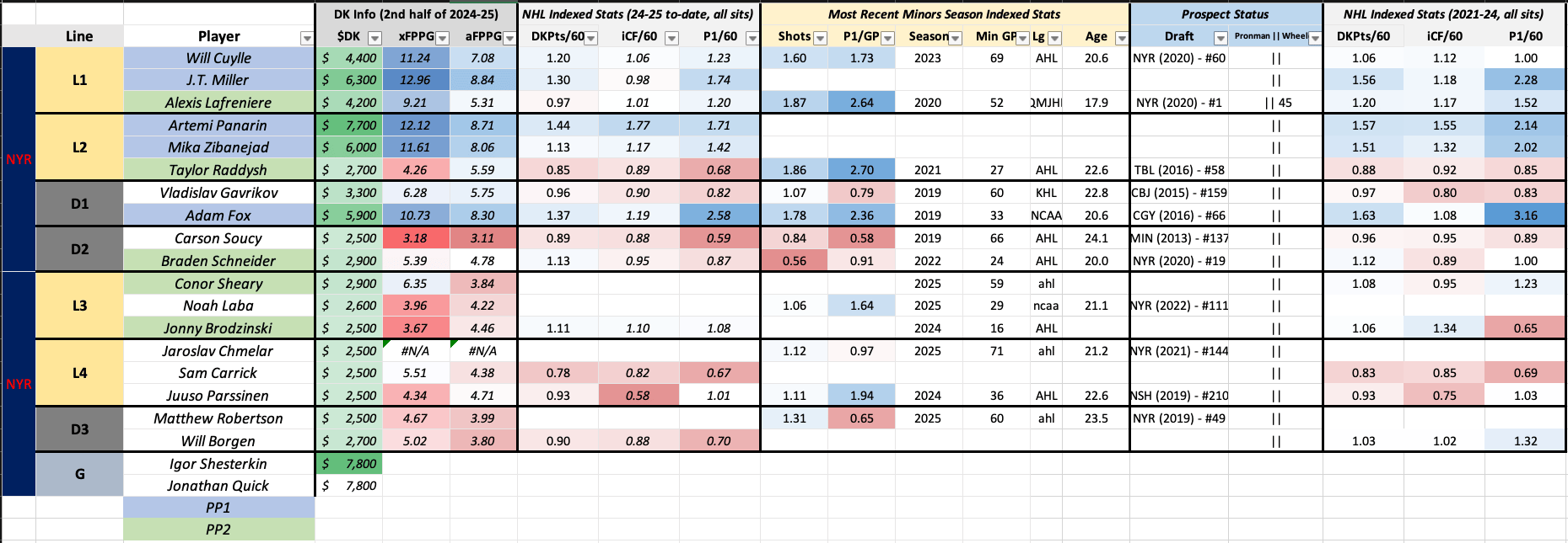 J.T. Miller appears dead-set on shooting for the time being, and he has the cheapest PP1 mate on his line while avoiding Taylor Raddysh (with Panarin-Zibanejad). It’s gross, but I’d like to save nearly $2000 on the line that doesn’t have Raddysh. In a winnable matchup in Detroit, who has allowed a reasonable number of chances of late, I could find reason to play NYR1 on Friday. I think I’m more likely to scoop some Will Cuylle value, as last year he was quite good and now gets his first crack at top unit production in a while, still putting up good underlyings without the added boost.