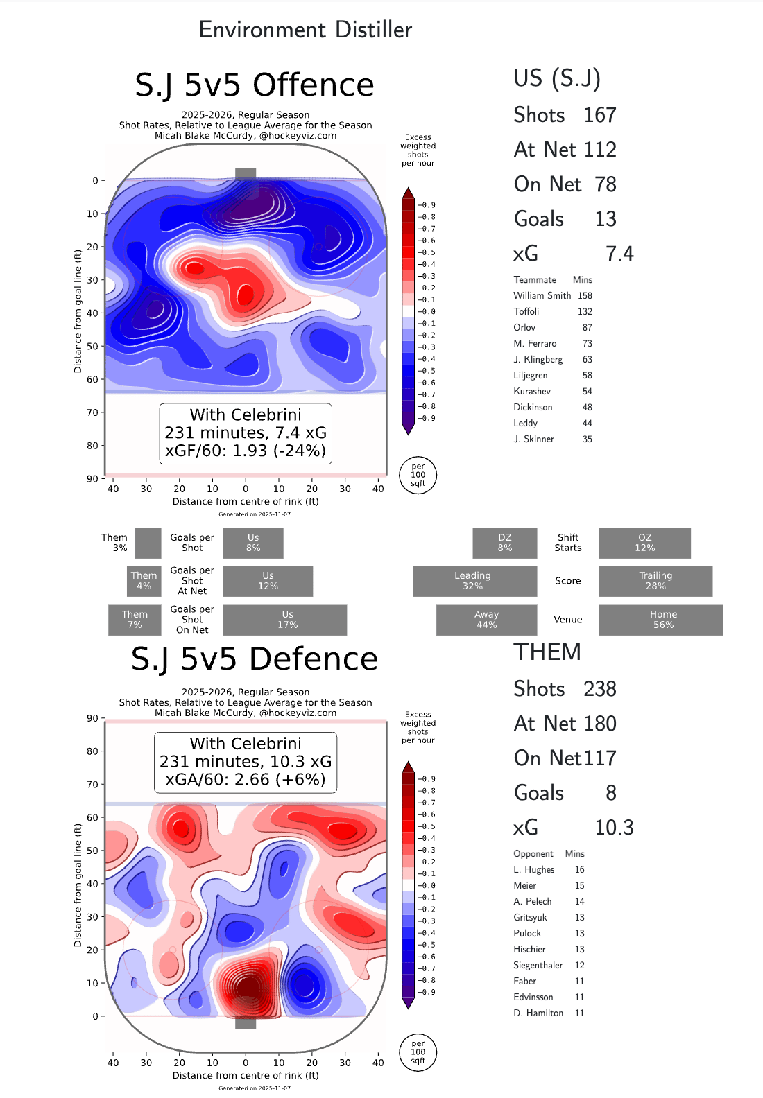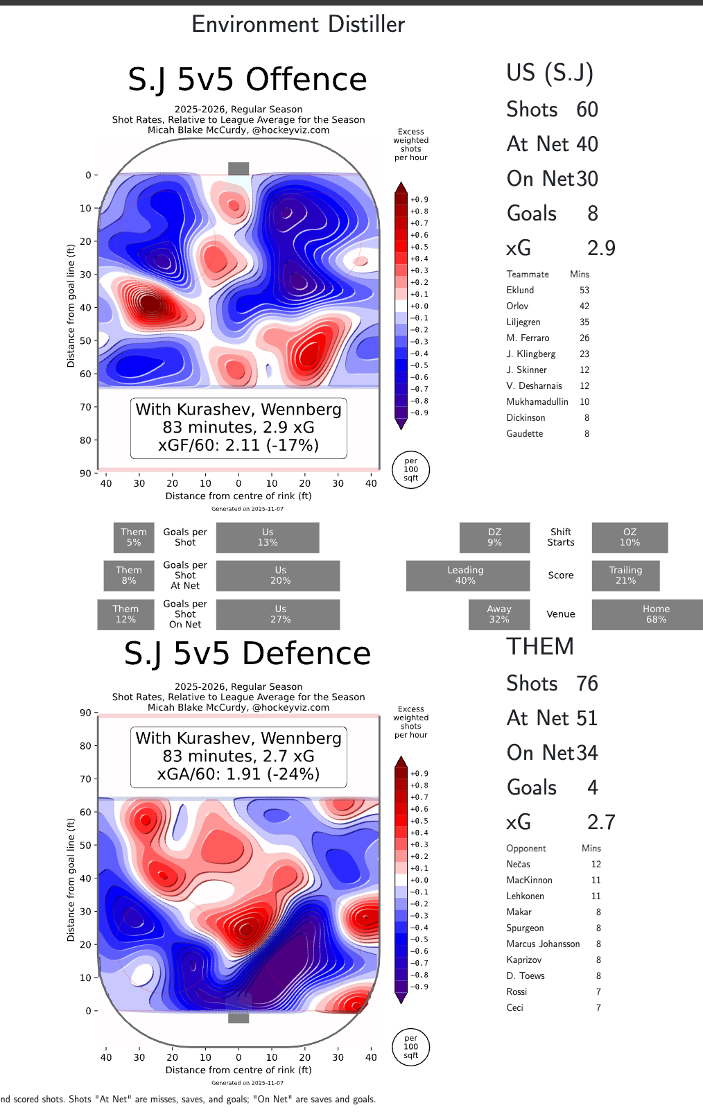 On the PK, it’s a bit of a different story. These Sharks are bottom 3 in both attempts and xGs against while shorthanded, and comfortably in the bottom 10 of actual goals against. Their defensive struggles appear limited to the PK for the moment, but given their extreme lack of talent I would wager the PK is closer to their true team defense talent than the 5v5 production as-of late.