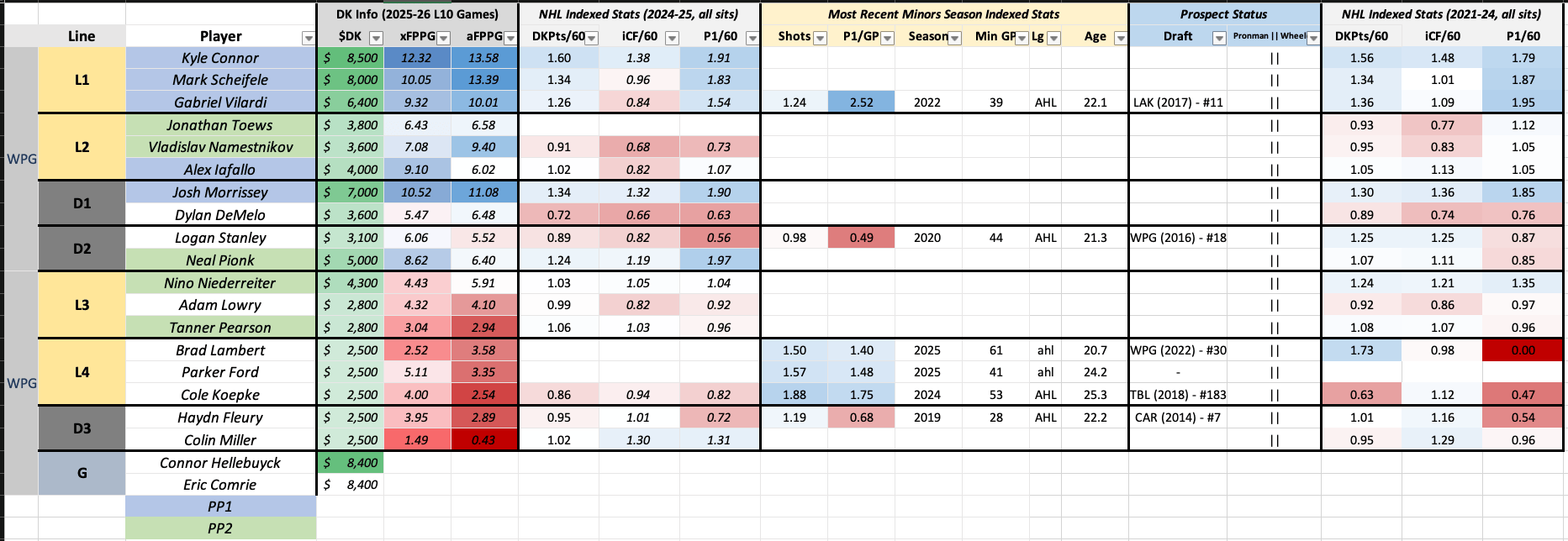 I can’t fathom ruling out WPG1 entirely, but you’ll need to figure out where your salary saved comes from and if two mid-tier stacks can fit together in a way that you simply can’t touch with WPG1’s prices. Josh Morrissey is priced head-and-shoulders above the rest at defense, but I don’t think there’s a ton of separation here. If building a PP1 team, he’s the guy I would leave off in favor of cheaper alternatives.