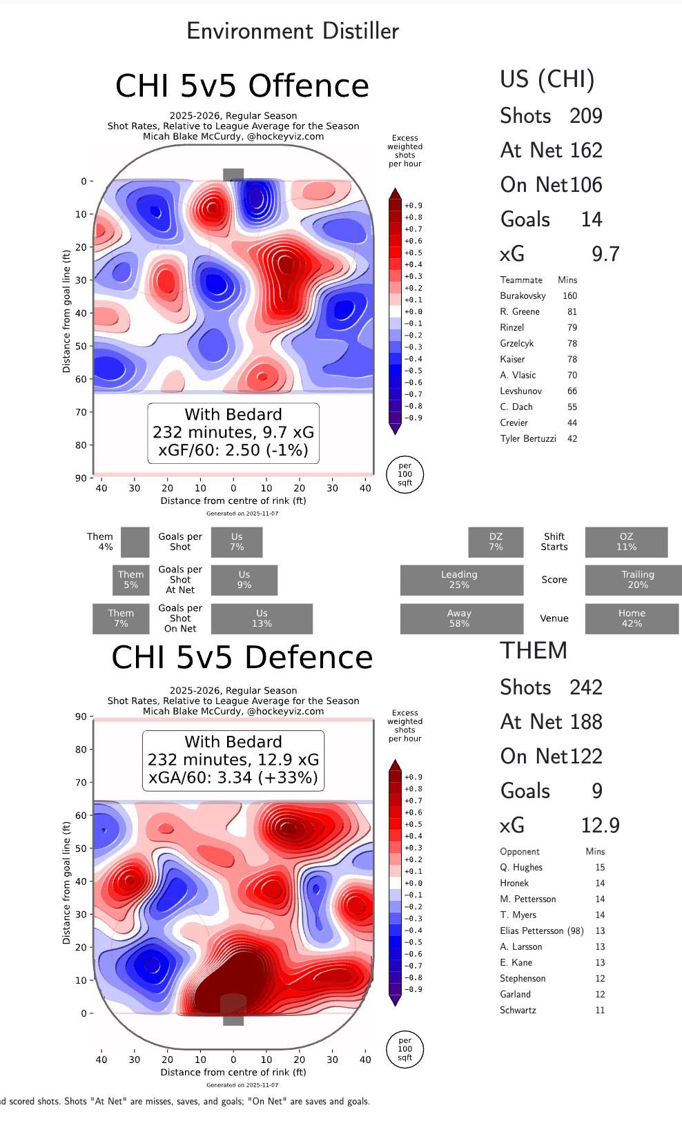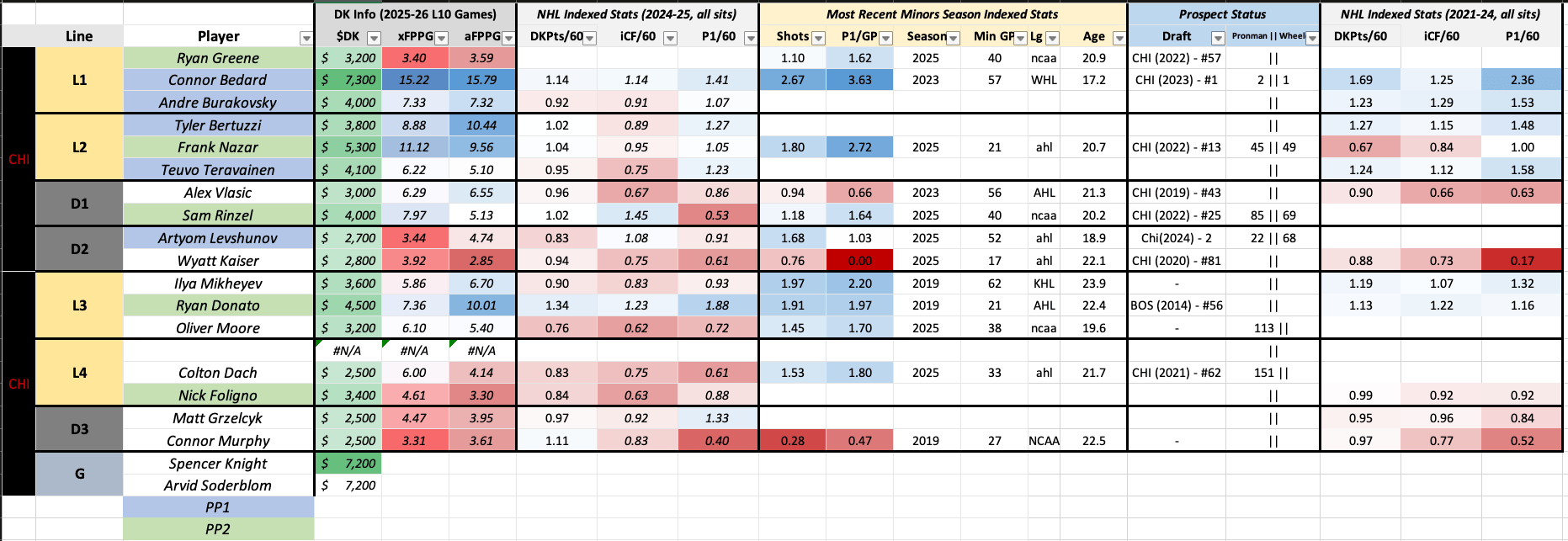 Other Hawks to keep an eye on: Artyom Levshunov got the PP1 work over Rinzel last game. 11F 7D makes any Chicago defender hard to play (especially Levshunov, who will be sheltered heavily). Tyler Bertuzzi is coming off a hat trick in Vancouver, and has the second best xFP production on the team. Burakovsky and Teravainen rounded out the top PP unit, and they look imperceptibly different from one another. Both are low floor, middling ceiling options at $4k. This new PP1 is cheaper than a Rinzel/Donato iteration, slightly, but is not something I am overly excited about. Capturing Bedard gets me the investment I am looking to make in this game, and I will strongly consider Spencer Knight in goal, should he start for just $7200.