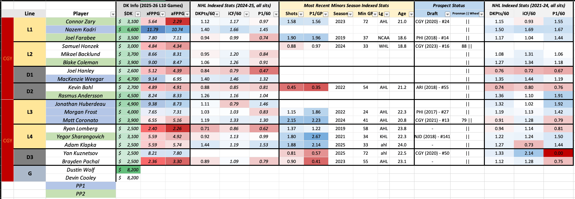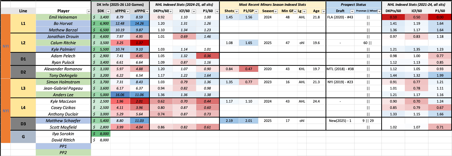 Matthew Schaefer is ridiculous, and Roy will let him off the leash when the situation calls for it. I certainly prefer finding Schaefer money in a game-stack than I do playing any member of the Minnesota Wild blue line. He’s running a bit hot, so I wouldn’t consider him at his price unless it was with other PP1 mates, but the talent is undeniable. Emil Heineman is an original Moods Dude, and Anders Lee, uh, leads the slate in xFPPG. I need more than three Dude slots. Alas. I like this game!