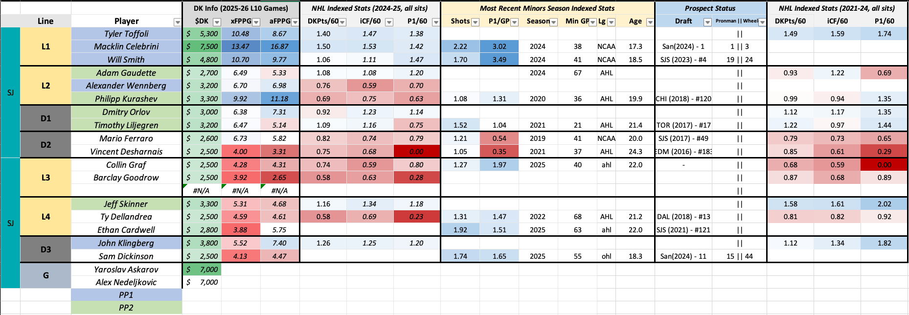The bad news is that Winnipeg has a monster total on the road in San Jose, and as a result are extremely expensive (even with Iafallo, the full 5-man PP1 costs a shade under $34000!). And if you consult the rainbow sheet, Winnipeg is slated for the worst 5v5 matchup on this slate. San Jose has been legitimately good! They aren’t even getting bailed out by goalies or anything…. they just are performing dull magic acts on the ice.