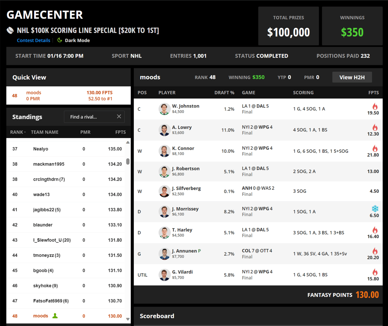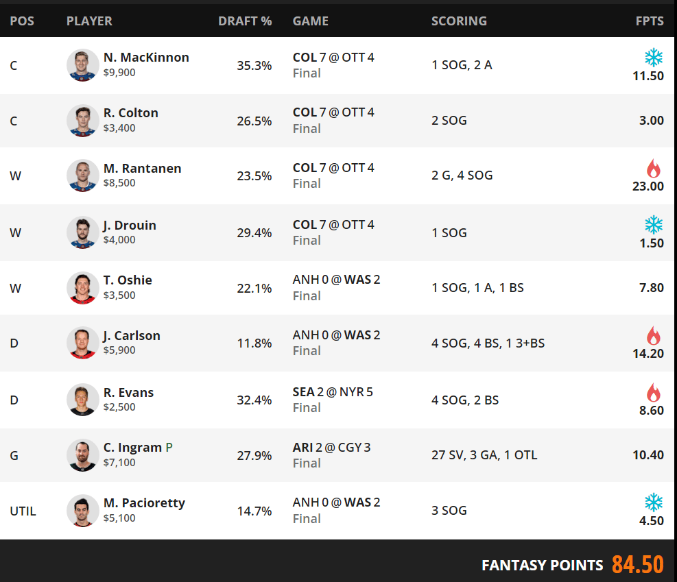I also played Justus Annunen in goal in the 7PM window. I felt that he was a good way to leverage the COL1 chalk while still benefiting from what I thought was an OTT team that would jump on the tired legs of Colorado. In retrospect, I probably should have left G open (it wound up the case that I could have played Oettinger or Hellebuyck somewhat easily), but with Annunen reaching the bonus and a W, I can’t say it was a total mistake, it just took a freak COL outcome (the depth contributing way more offense than I believed possible) to make it pay off.