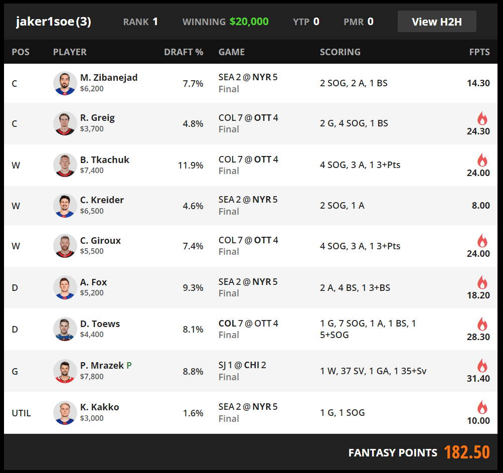 NYR1 taking on a banged up Seattle squad led the way, with Fox providing a separator score on defense and NYR1 doing more than enough (jaker1soe won the contest by 20 points despite the relatively low output from NYR!) when paired with OTT1 + the Devon Toews bring-back to the gamestack. OTT2 was a near-perfect stack, the only flaw being that all three were stuck on 4 SOG. Mrazek in goal was the highest score of the night, and was clearly more than enough to win.