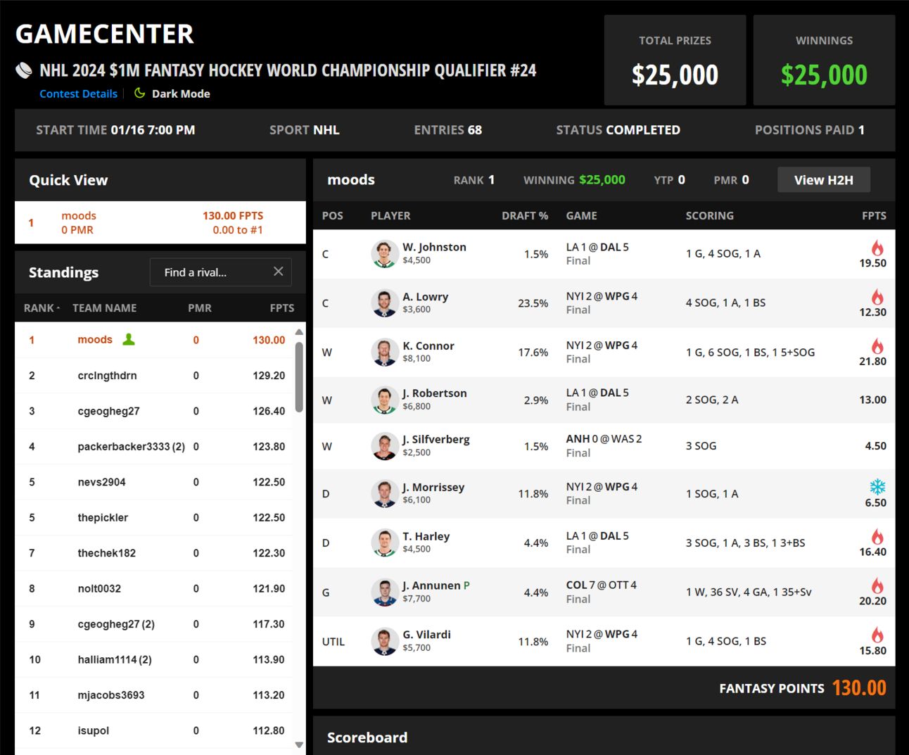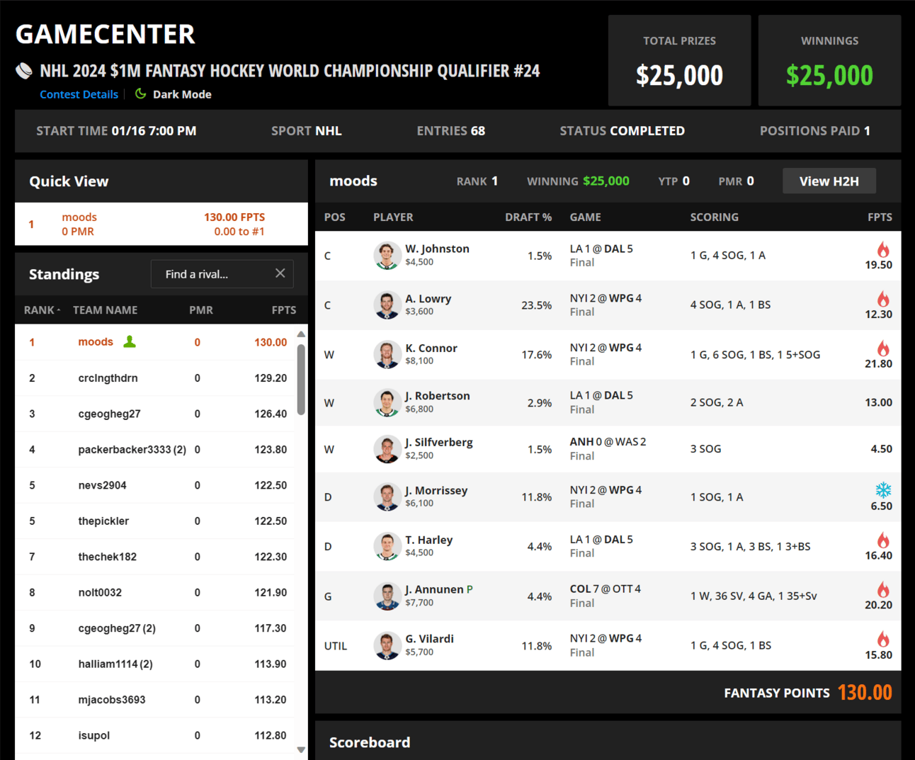 Results: I held off a late CGY2 push (second was 4v4 me, shockingly, with CGY2 vs. my Wyatt/Jrob/Silf, and Annunen vs. Mrazek), faded a Kadri OT winner from 3rd place (that OT assist by Kadri brought him to within 3.6 points), and survived TOR PP1 (Matthews/Marner/Rielly) from thepickler with EDM getting a late goal to prevent the game from going to OT. This contest was incredibly close, so there are several other plays (Jack AKA Packerbacker noted that a NYR goal was credited as unassisted that could have realistically had two assists vault him over me with those 10 DKPts) that could have ended my FHWC dreams.