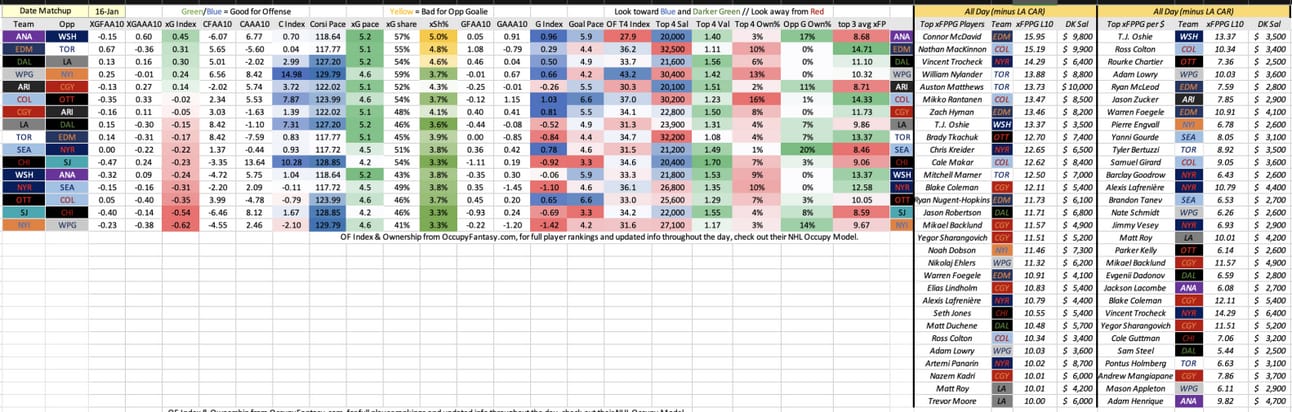My Strategy on Tuesday night is pretty complex to describe, but I had a relatively one-track mind the entire time leading up to lock. I was extremely intrigued by the availability of late news on WPG and DAL, home teams against B2B teams that had middling matchups on paper, but that my xG Index stats (from the screenshot above) pinpointed as good matchups when adjusted for the slate. I wanted to prepare for that situation.
