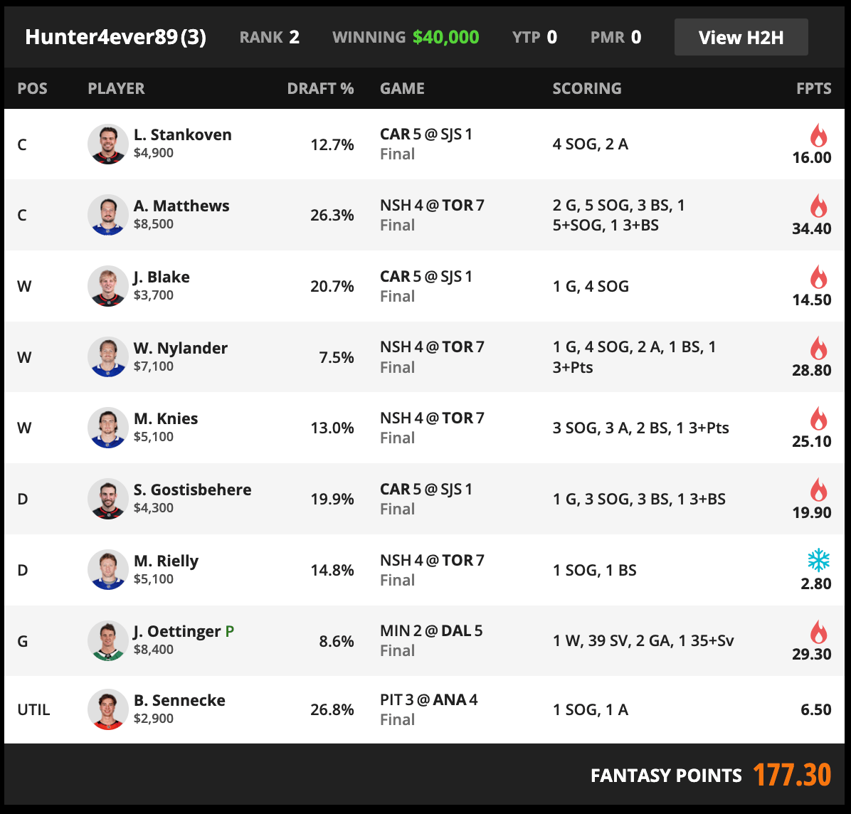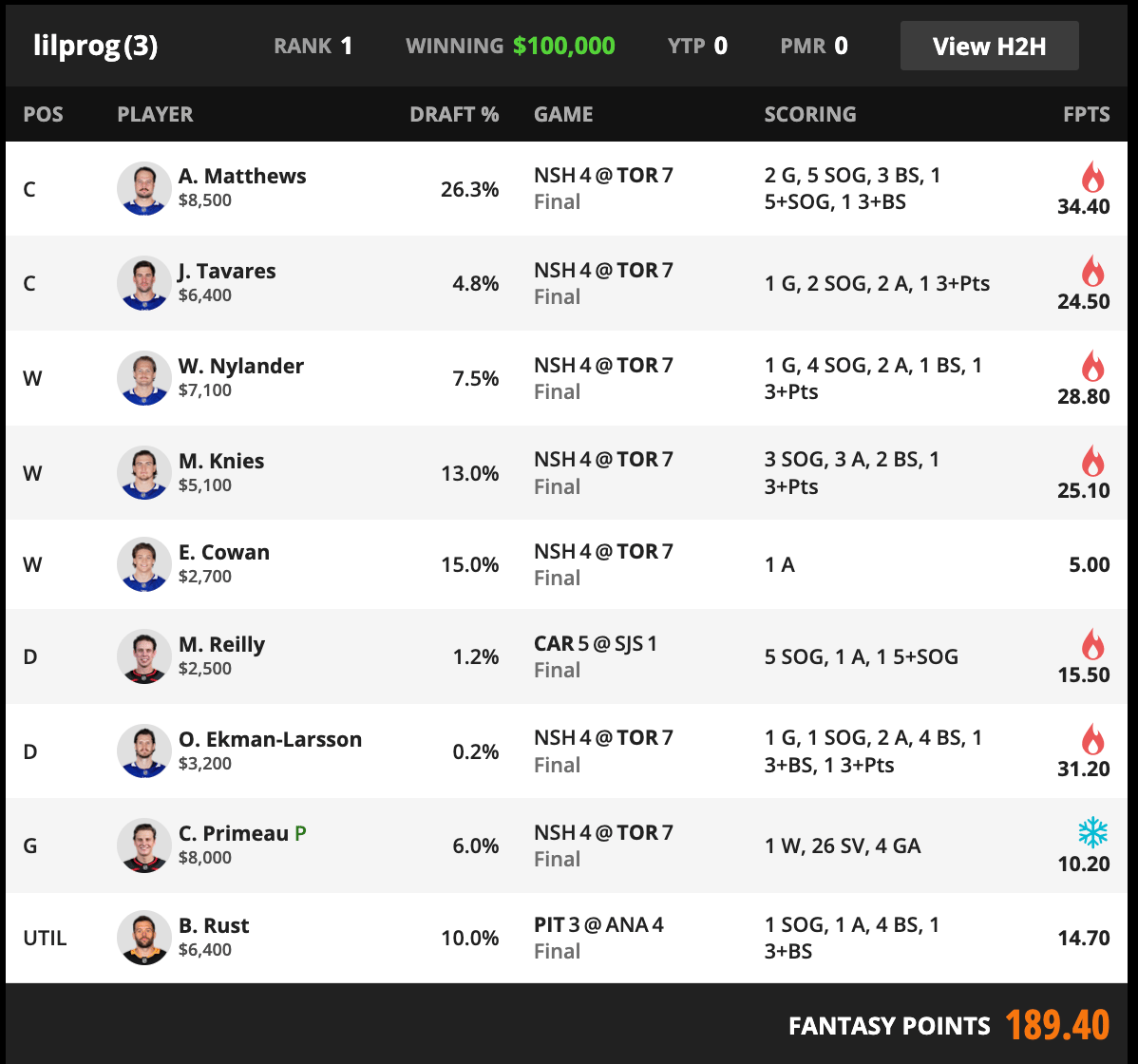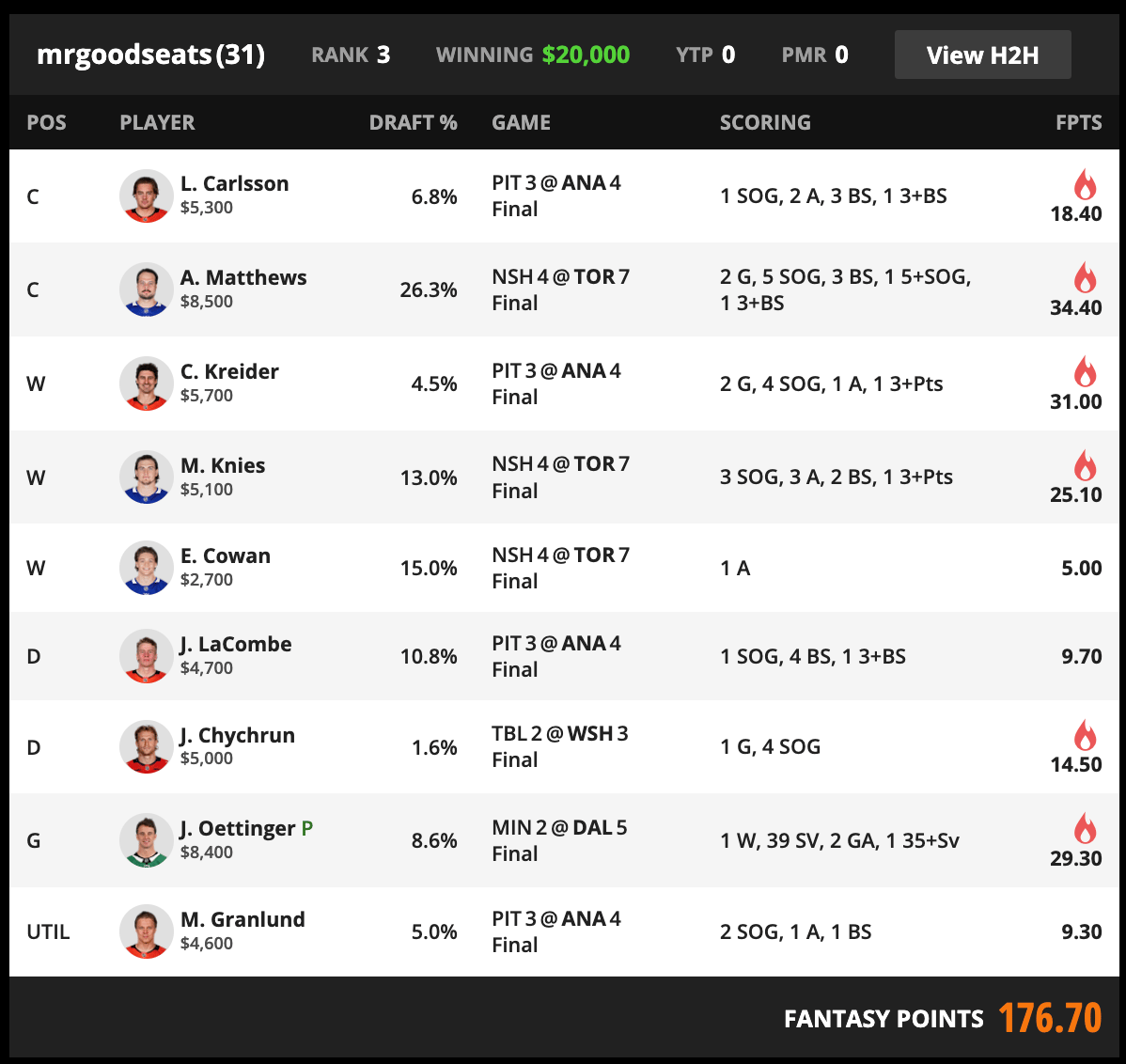 mrgoodseats ran out the DFS masterclass of a lineup for a cool $20k, using the standard TOR1 line and turning the ANA chalk on its head by jamming Kreider-Leo, a very sharp move. I personally probably just play Killorn on it, rather than Granlund, but that makes it a 5v5 stack rather than a PP stack, and the PP1 is what won for ANA on Tuesday night. I could do without a 11% Jackson LaCombe, but the field playing him with ANA2 was my main issue with the play, and he actually did correlate with the PP stack mrgoodseats built. A very, very sharp team was finished off with Chychrun (an elite D play at just 5k and Sonny Milano on the PP1 - who knows how long that could last?) and Oettinger made a super late charge up the board. This finish probably ran a little bit bad, actually, as after the PPG to put them up 4-3, and Kreider on hat trick watch, Joel Quenneville ran out ANA2 to defend the lead. Cutter can fly, Mason is a faceoff ace and has a supercomputer in his head, and Sennecke has elite awareness at both ends, so this isn’t a total surprise (and I love the move!), but usually veterans like Kreider and Killorn are used to finish off games, he wasn’t tired, and he was on hat-trick + 5 SOG watch with Leo sitting on 2 assists. Those bonuses were absolutely in play and would have wrapped up the $100k for him. As it turned out, no one scored an ENG and he has $20k for his troubles. I don’t feel too bad.