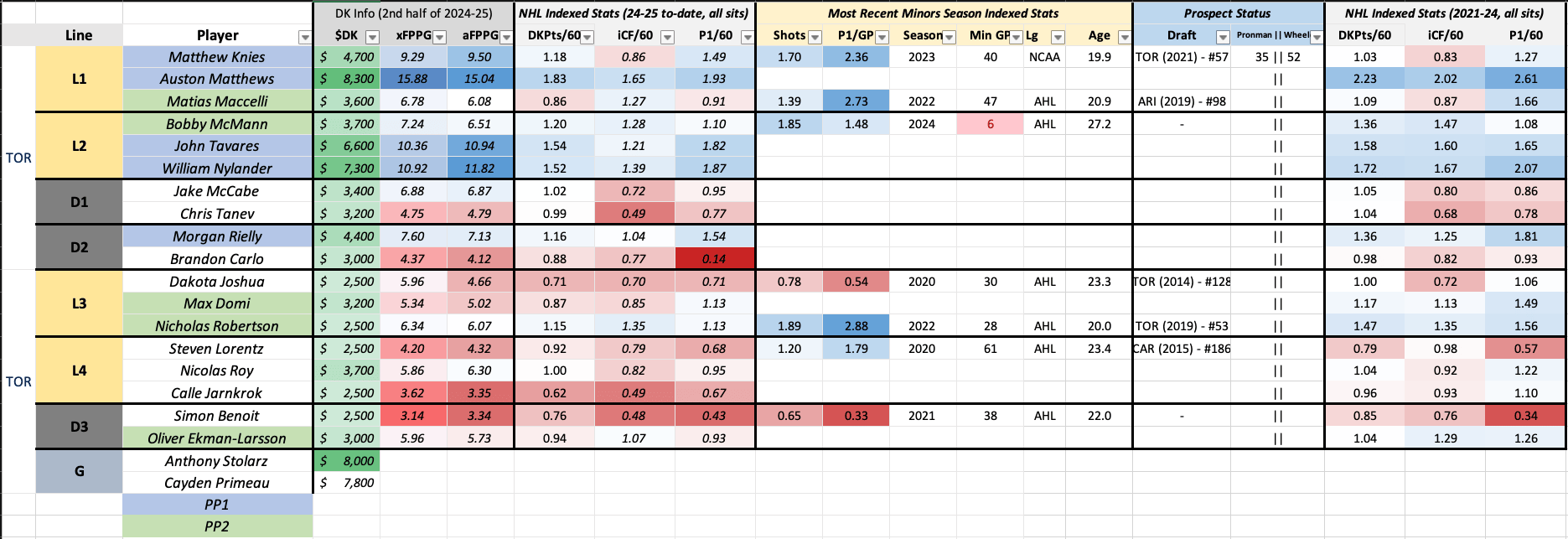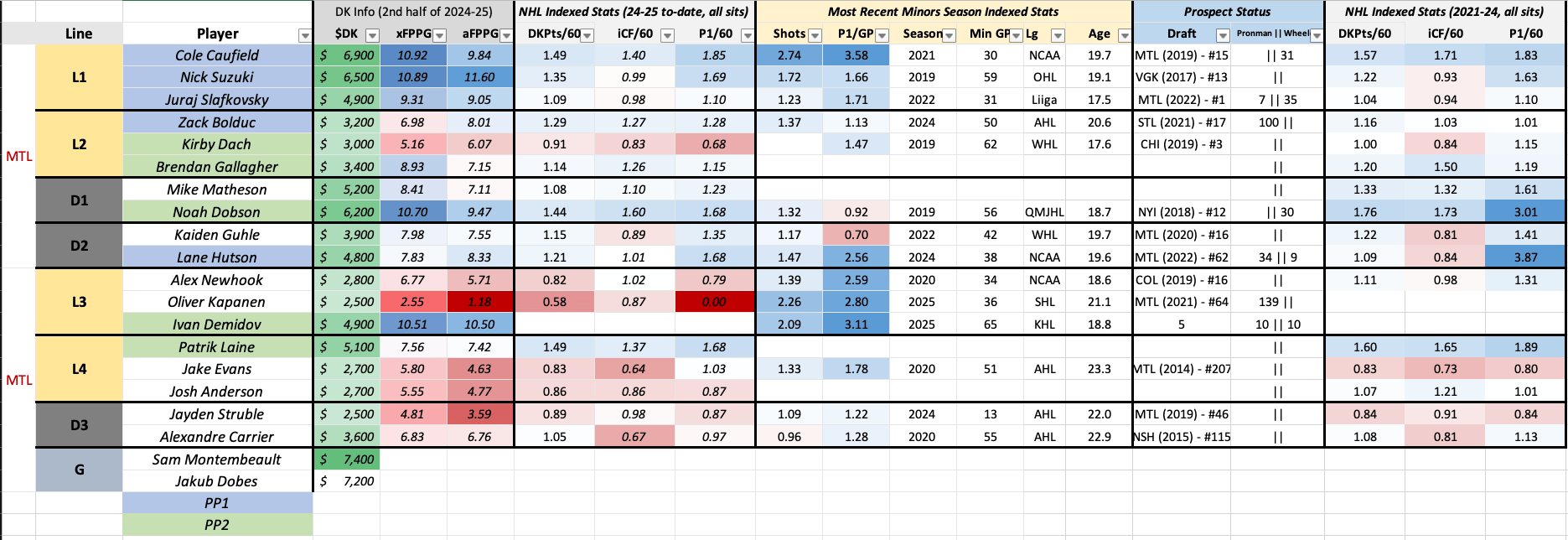 Morgan Rielly is a player I want to be early to in 2025-26. I believe that the player you see on the far right, who earned DK points at a rate 36% higher than the average defenseman, is closer to who he is than who he was last year (just +16%), almost entirely thanks to Mitch Marner taking his PP1 job at running the point. Now that Rielly can run the PP1, I think he resorts back to the perfectly effective point producer he was before last year. $4400 against Montreal is a gift, especially stacked with one or two (or overstacked with) Toronto PP pieces.