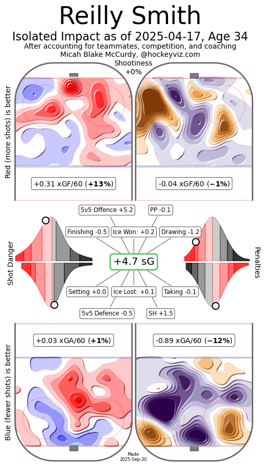 The final piece I’ll mention is Reilly Smith, as $3300 is a nice tag for his historical ability, and even though he’s continuing to age, outside of a dismal run away from Vegas, he’s shown a shot-first mentality and never before has he played with both Karlsson and Stone, two aggressively-slanted passers. Smith should also be a clear triggerman on the VGK PP2, as well, making him a core value option. Micah’s stuff still thinks Smith is pretty nice with it, even though last year wasn’t a great year statistically: