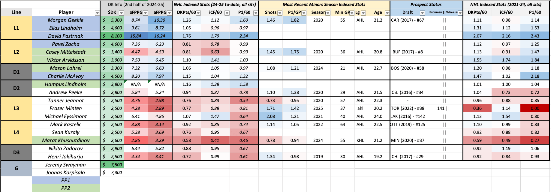 While Morgan Geekie and Elias Lindholm are priced up for their L1 PP1 roles, Charlie McAvoy is not. There’s a bit less translatability between McAvoy’s excellent 21-24 sample and the 24-25 struggles relative to that level, thanks to the Bruins being a completely different (and worse) team than those prior Bruins clubs. However, it’s at least going to be a good way to double down on your Pasta leverage bet by pairing him with McAvoy, seeing as Rielly and Bouchard should get significant ownership in stacks with their forwards.