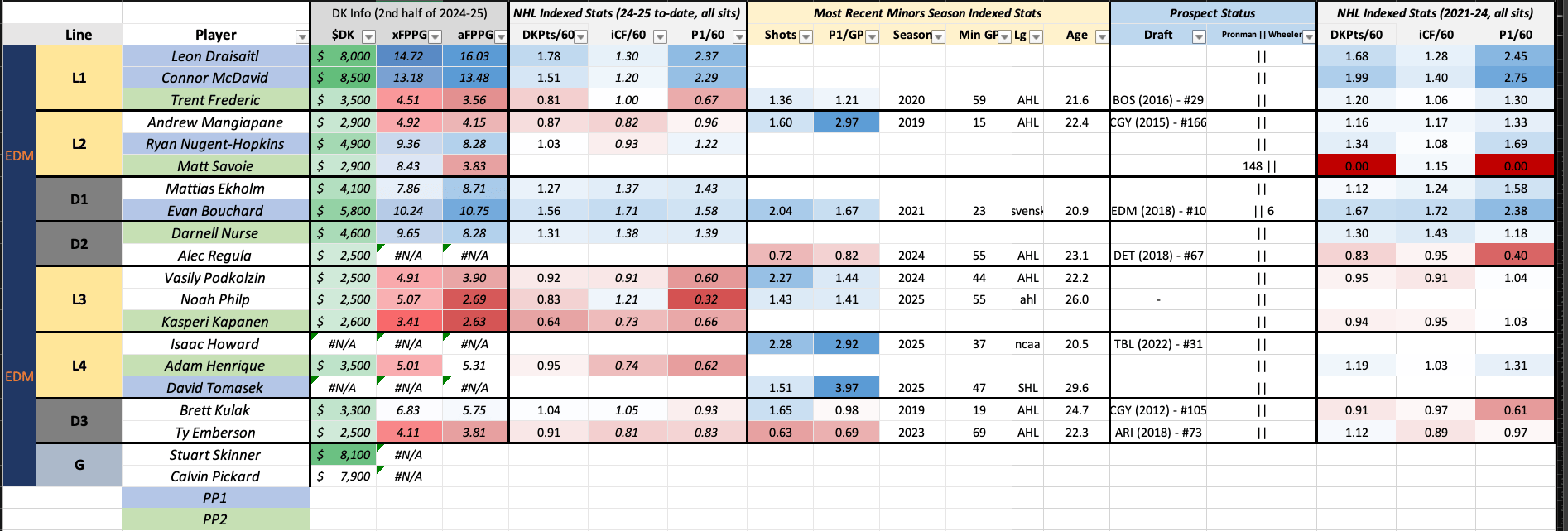 Evan Bouchard is also distressingly cheap, and we know that - at home especially - he will spend the majority of his TOI with McDrai and is already one of the best fantasy defensemen in the game, so let’s just call it 22.3k. You can definitely afford it!