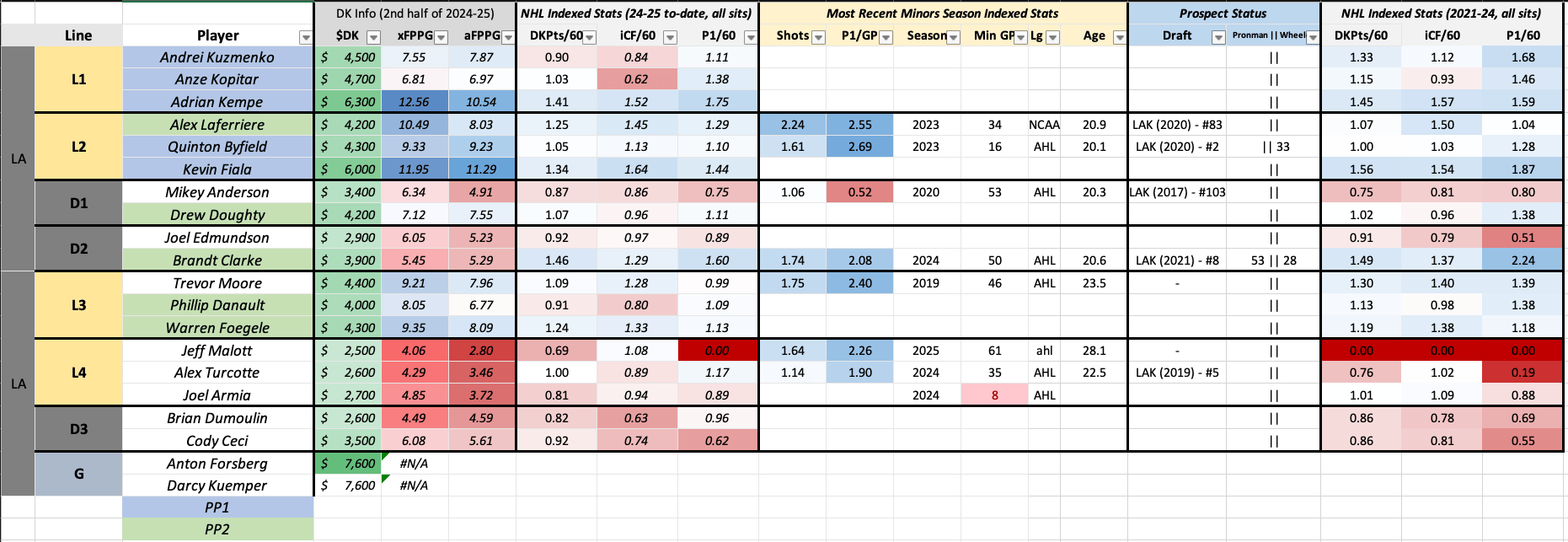Brandt Clarke at $3900 is interesting but not a core target, as it’s not too far from him up to a Rielly or McAvoy, but if he plays 19-20 minutes all year he’s going to get piles of fantasy points with how he blocks and shoots pucks. His stats from last year don’t look great in the aggregate because of how the season ended with him playing a very reduced role, but for his TOI he’s always been efficient, generating fantasy points at a 46% greater clip than comparable D last season, and +49% rates based on just the first 25 games of his NHL career in years 1 and 2. He looks every bit the part of a fantasy stud.