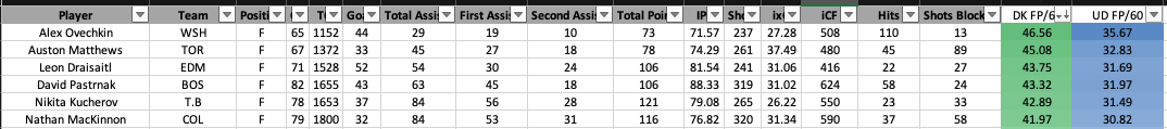 When healthy, Pastrnak is still among the best, even solely focusing on last year in the new Boston environment (one that was mostly without Lindholm and partially without McAvoy, even!). All four of the top DKPts/60 players last year are active on this slate: