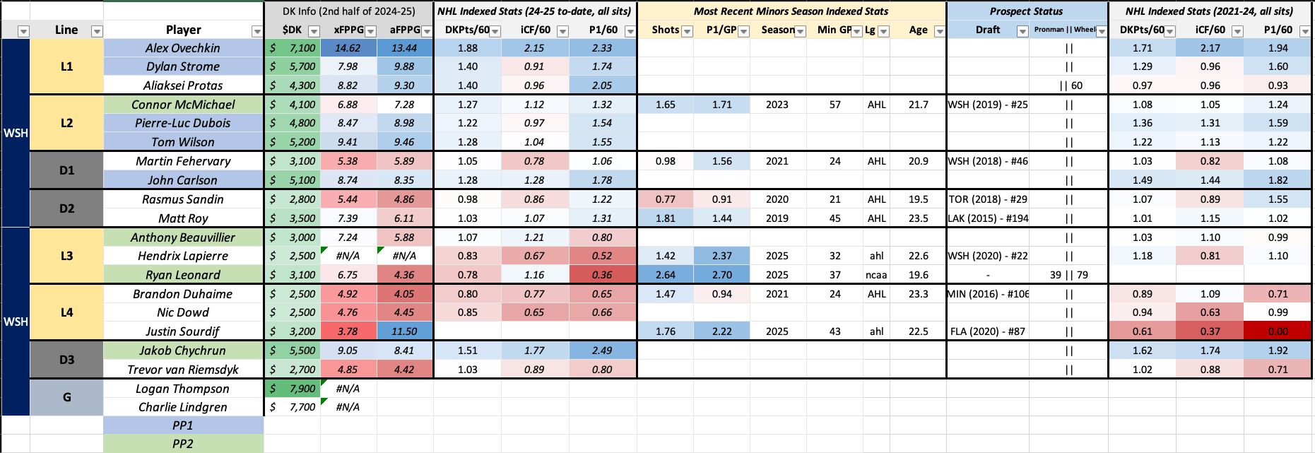 I like Tom Wilson’s price fine, I dislike Strome, John Carlson, and PLD even, however. PLD I would only play in a full WSH2 stack, including Connor McMichael they are $14.1k against Boston depth. PLD + Wilson were significantly better with McMichael than without in 2024-25, and importantly McMichael upped the pace on this line dramatically (the offensive impact was -2% without McMichael to +15% xG generation).