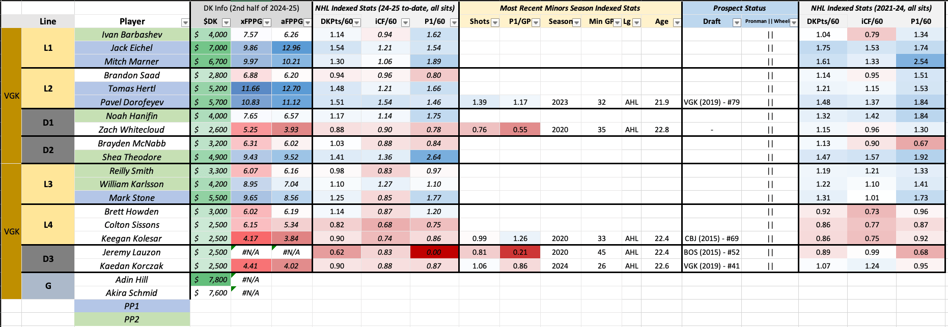 Theodore’s price at $4900 makes sense, but especially so in lineups where you’re also stacking Eichel-Marner with a $4000 Ivan Barbashev, effectively making it a bet on this game taking off at 5v5.