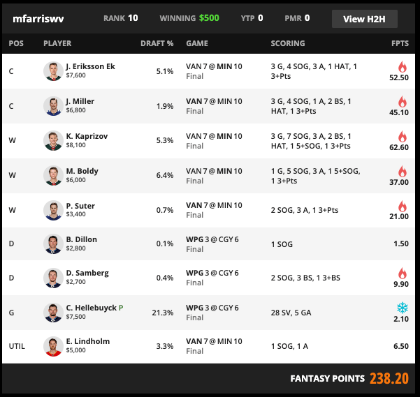 HossDaBeast wound up in 4th place with a stacked Boeser, Gibson’s win, 21 Ryan Suter points, and two goals from a TOR2 stack to cap it off. Seems impossible. The problem is he stacked Pettersson and Lindholm across 5v5 lines with Boeser, which was only a 30-point difference off his linemate JT Miller, who did far better than fellow JT John Tavares in his lineup (who posted 5.6 fpts)