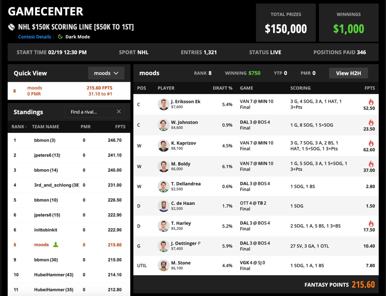 Kylington scored the first goal of the 4PM window… Dallas blew their lead and lost in a shootout with several chances by Harley (post) and Johnston (missed net on 2 on 1 feed from Harley) to end it… MIN1 scored like six goals while I was on a fifteen minute outdoor excursion (some call this a “walk”)… Mark Stone didn’t do much… Logan Thompson’s shutout flew by me on the leaderboards and ultimately left me top ten with no path to first in an extremely top heavy contest… Calvin De Haan did not record a fifth(!!) hat trick on the slate to carry me to the top of the leaderboards, sadly, while Crevier outscored him by ~7 and Kylington by 10.