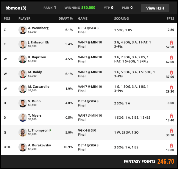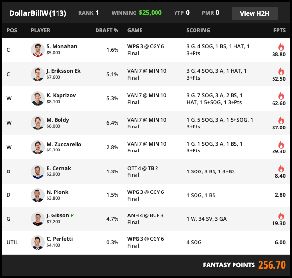 In the $15, you needed to be a bit more.. Perfetti.. to win, as DollarBillW paired the nut MIN1 + Zuccarello stack with Monahan’s hat trick, needing very little out of Perfetti/Pionk to beat… himself… with MIN1 + Kadri (and my friend Kylington!) in 2nd place.