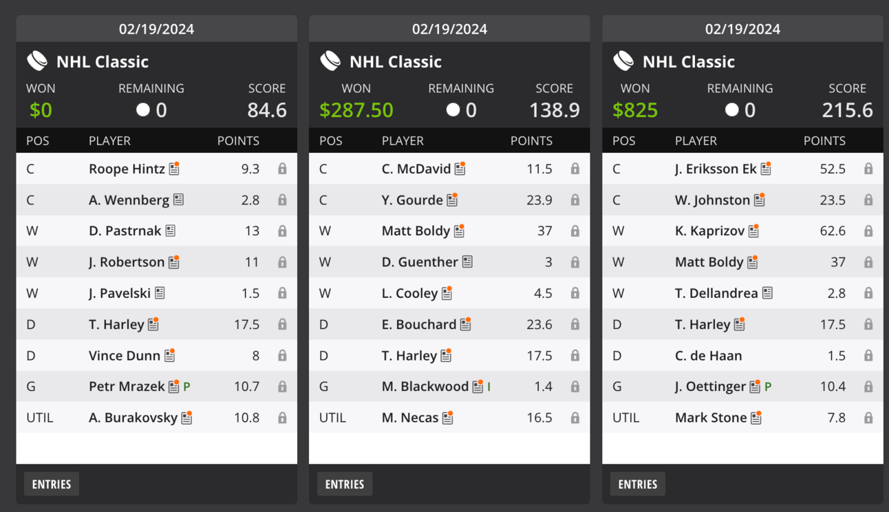 After going Stone on the contending team and considering what I felt would be some VGK2 ownership, I figured I’d rather try and capture VGK production through Stone and fade VGK elsewhere, just in case, leading me to swap VGK2 + Theo + Stone to McDavid/Bouchard, Guenther/Cooley (listed at 5v5 with Keller), leaving enough for Necas. Boldy wound up “only” scoring 37, a phenomenal performance but clearly you needed to have the ~120 points that JEEK Kaprizov accumulated to get to the top, which effectively ended what I felt was a fun build betting on McDavid getting there without Perry (check) with a game-stack element based on late ARI news that clearly improved their outlook.