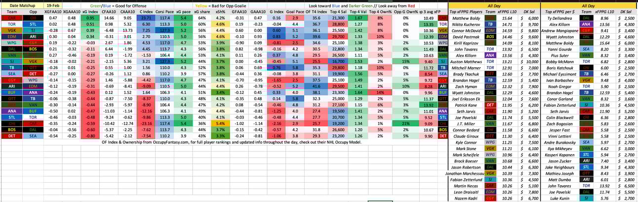 My summary of the slate, with L10 indexes (adjusted for Opponent) on left, some Occupy Fantasy data in middle, and expected FP player data on right