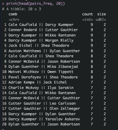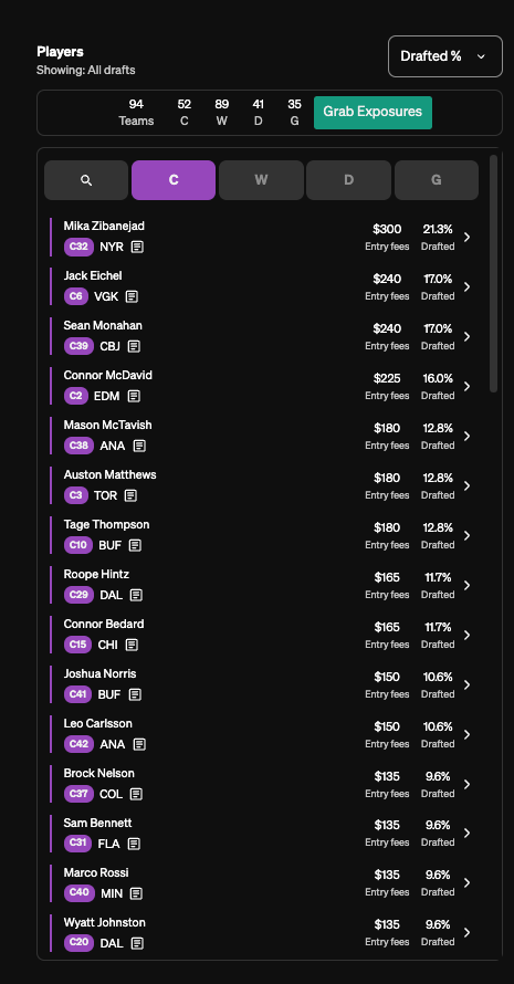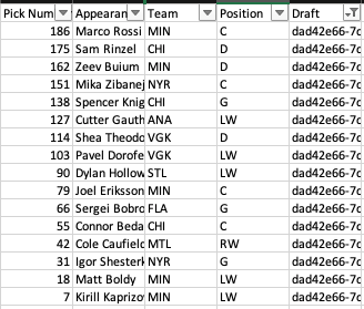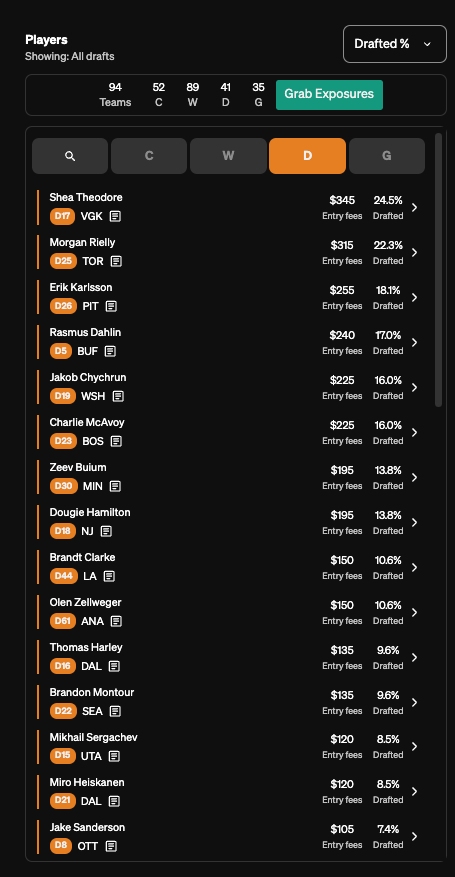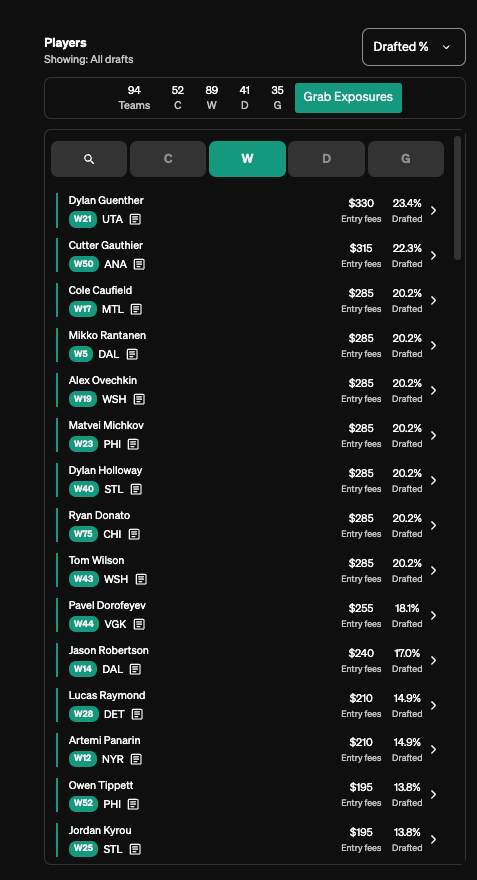 I find it rather intesting that more than half of these, even removing the goalie-related ones, are not team-based stacks, but merely a mixture of where on the board my pick was (front half/back half/middle) and my exposures. Theodore and Cutter making up four of the five team pairiings on this list makes sense, too, as both involve later picks that I feel more comfortable giving up 5+ picks of ADP value to connect on my roster. Michkov and Tippett also fits this mold, though there doesn’t appear to be a ton of natural correlation in those two at this point in time, so I may want to focus more on other stacks on Michkov teams (or figure out what the hell to do with Zegras).