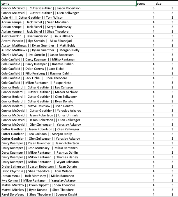 My triplets also don’t look too strange, on a scroll. Matthews-Guenther-Rielly is fun, while Theodore/Cutter also show up a lot here too. The McDavid-JRob duo is one that I’ll be mindful of down the stretch, though I think if I stack around either (Bouchard/Harley/Miro) that’d immediately take care of any duplication concern, as it seems I have largely random players as the third with those two right now.