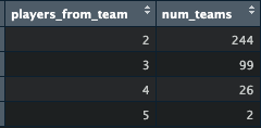 I have 127 stacks of 3+ players across 94 teams, which seems about right. I am getting mini-stacks to support the “main stack” of my team, but don’t want to overprioritize correlation over the other things I think about when drafting, chief among them being strict ADP value so as to ensure my successful combinations of league-winners don’t wind up dominated by similar pairings with better supporting pieces (a 8th round pick in place of my 10th round pick, if I am reaching two rounds for the eventual league-winner, for example).