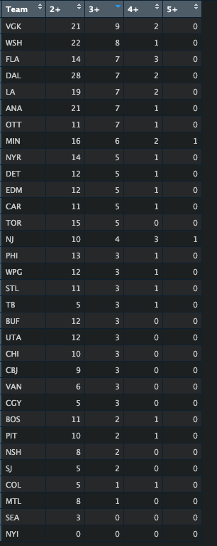 Vegas being the top team is no surprise, with Eichel/Marner/Dorofeyev/Theodore/Hertl all being very much in the Best Puck mix for me this year. I did not pull goalies out of this equation, so Adin Hill could possibly be counting toward this total on occasion, as I have 12.8% of him and am not intentionally taking him with/without other Vegas pieces.