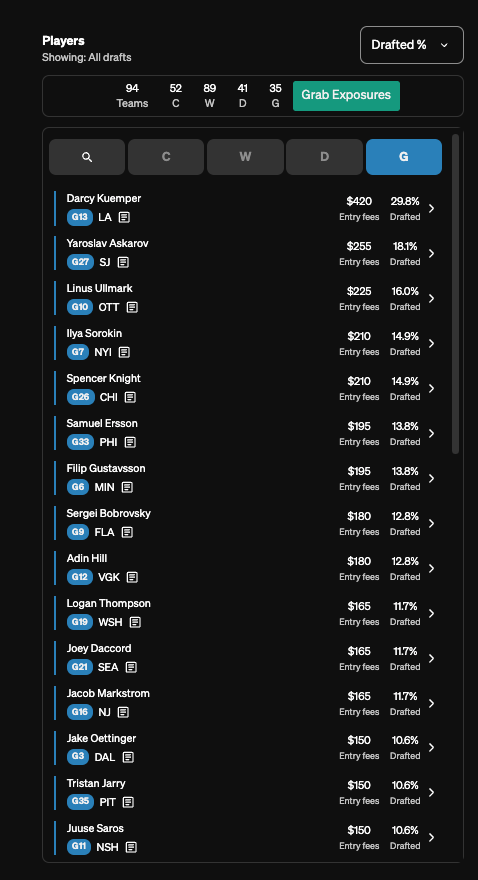 I have a lot of Darcy Kuemper. Again. After 31% of him last year, it’s shaping up to look awfully similar this year. Part of it is just a stubborn belief in this Kings team and system, even with a questionable offseason that effectively turned Gavrikov and Spence into Dumoulin and Ceci, but the other part of it is.. look at this range? What the fuck else am I going to do, especially if I want to up my Michkov/Guenther exposures in rd4 where a glut of goalies tend to go?