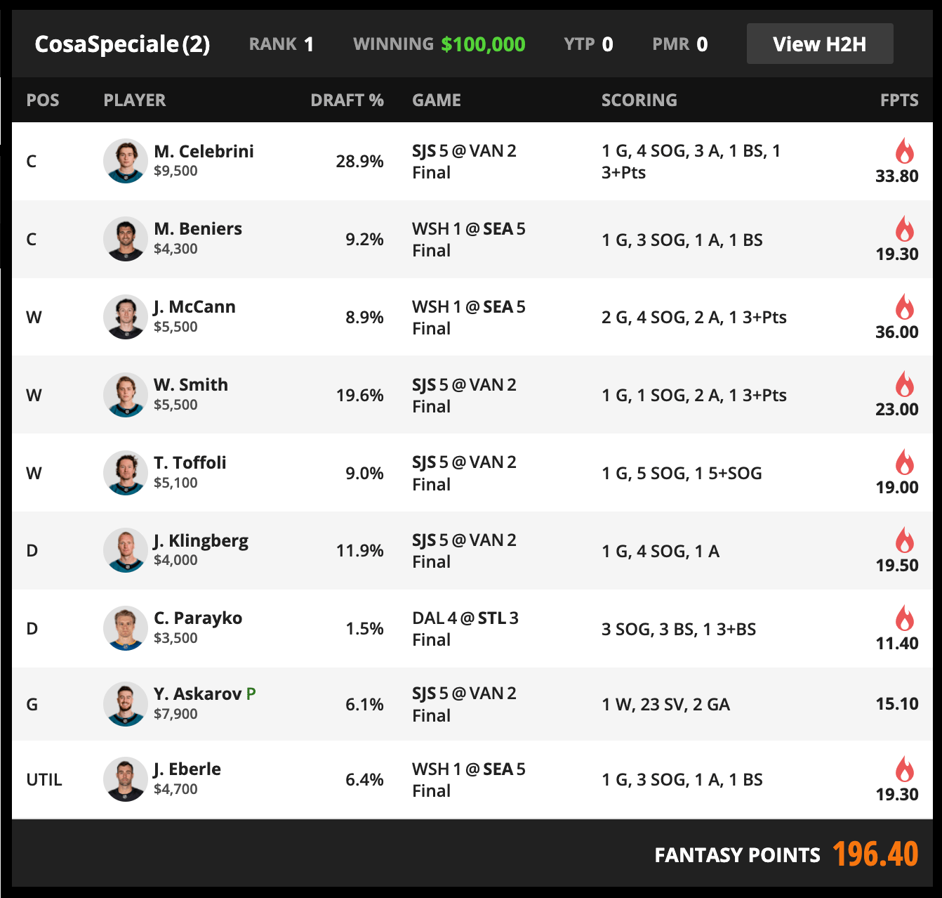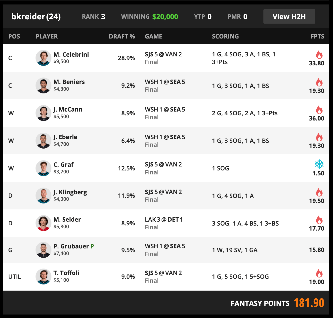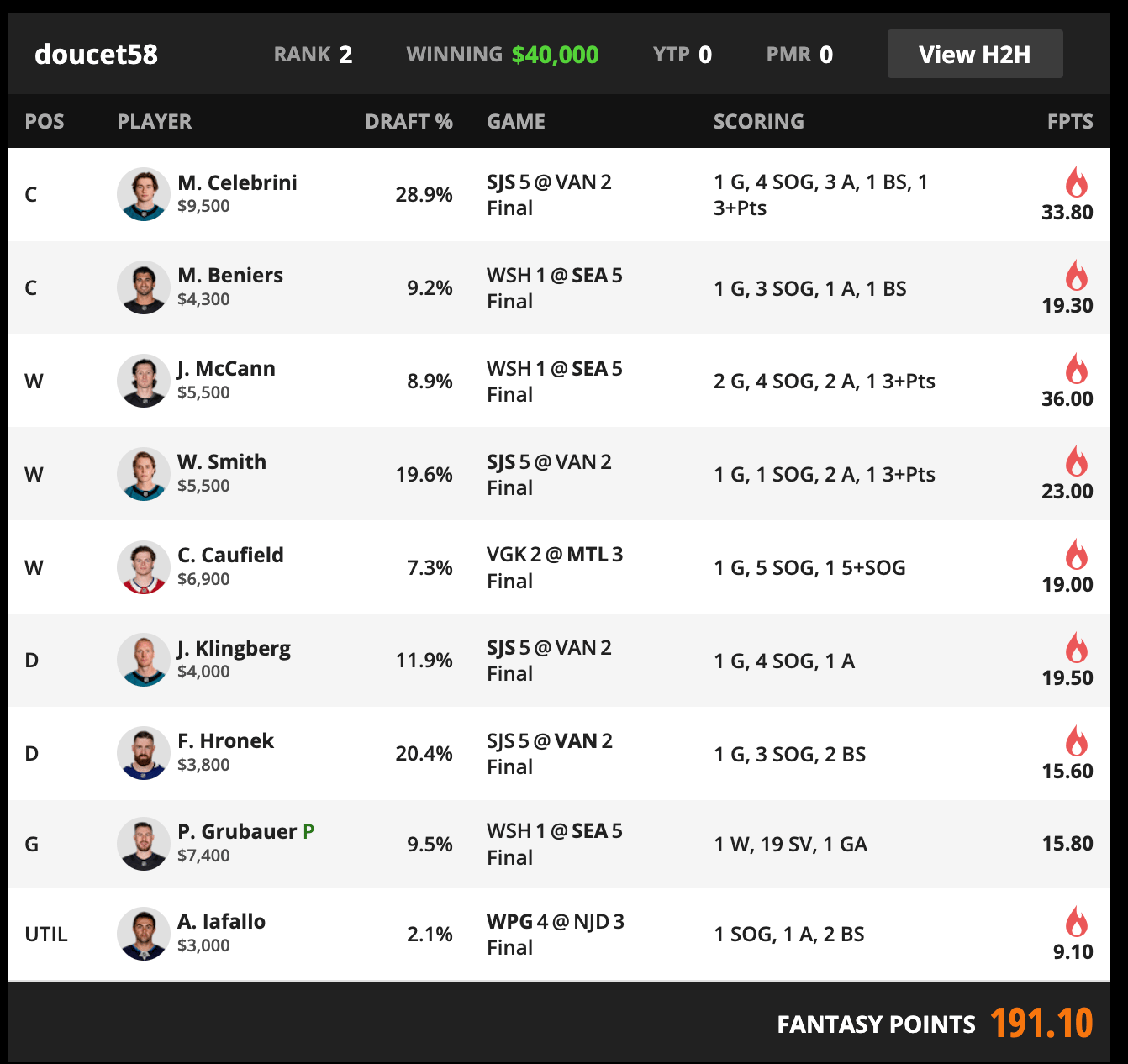 In second place was doucet58, which was good for $40k and a $20k FHWC seat in the $25 qualifier in the lobby on Tuesday. This team featured Beniers-McCann mini alongside the same SJ PP stack as Cosa minus Toffoli. This left much more room for activities, which was closed out with Caufield, Iafallo, and Hronek, who all got there as one-offs, with a Grubauer W. This result is pretty much the same with Lekkermaki over Alex Iafallo + a goalie in the 7.9k range (not Askarov, since Vancouver), but Iafallo without Connor-Scheifele is strange. I assume that’s a projection play, and there are $60k reasons to call me a fish for that take.