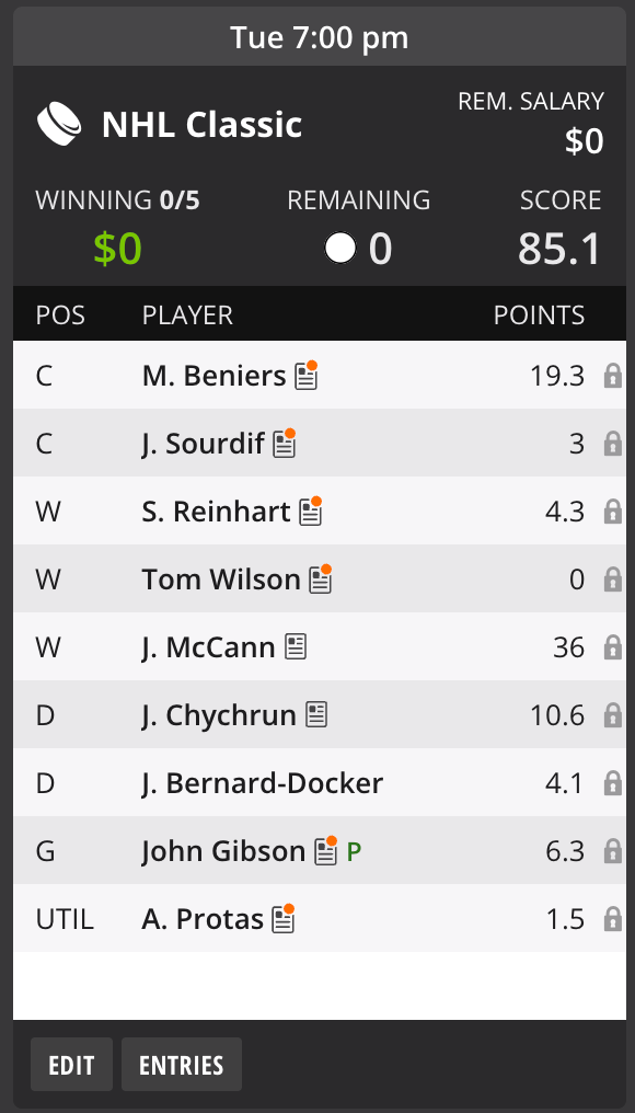 Jared McCann was a victim of the weirdest play I think I’ve ever seen, and had a hat trick negated due to a high sticking penalty judged to have occurred 45 seconds before his goal. I cannot stress to you just how confusing this was in the moment, and I am still unclear as to how this can even happen. 45 seconds of game passed before a linesman decided to volunteer that there was a high sticking infraction, at which point the refs spent several minutes reviewing it before ruling that Jared McCann’s hat trick goal was no longer. However, the clock doesn’t reset, so an entire minute was just wiped of all stats. Only in the game that I game stack could this possibly fucking happen. McCann wasn’t enough to get me all that close to the cash line, hat trick or not, but my WSH line got their teeth kicked in by Chandler Stephenson, so I didn’t deserve to have a sweat anyway.
