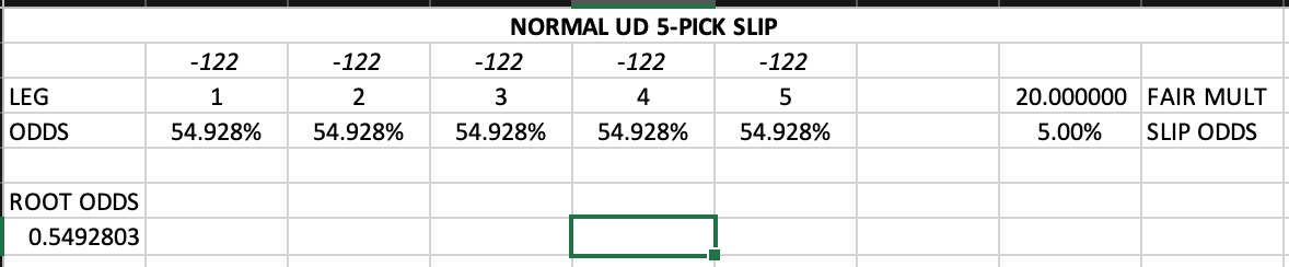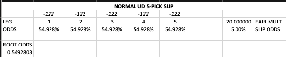 Think of it the same as before, but I’ll spin it differently in case that last one didn’t quite catch: When you’re being paid out 20x, you need to win 5% of the time to break even. When you pick five legs all of which have a 54.928% probability of hitting, the independent probability of all five legs hitting (and thus you being paid out) is 5% on the nose. Translated to American Odds, this would be like picking out a sportsbook bet that was -122 every time.