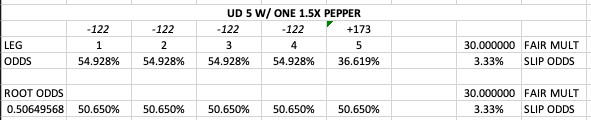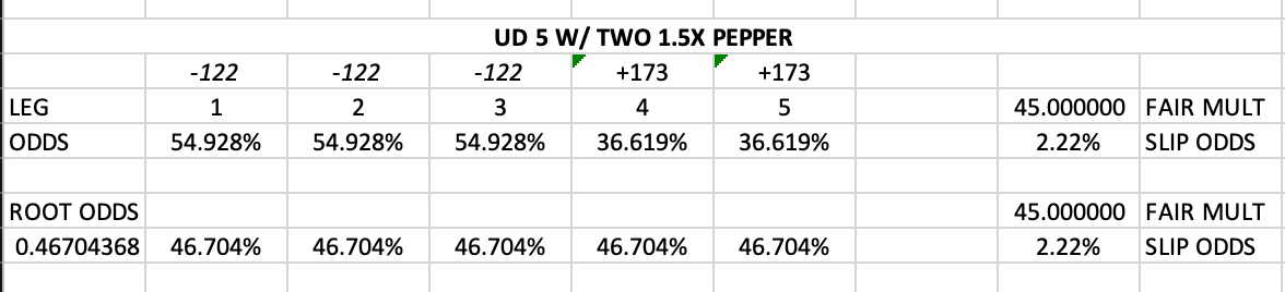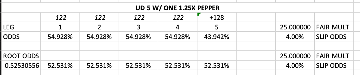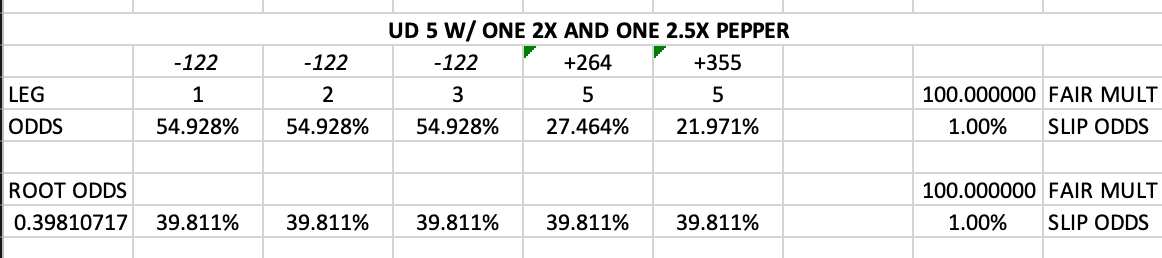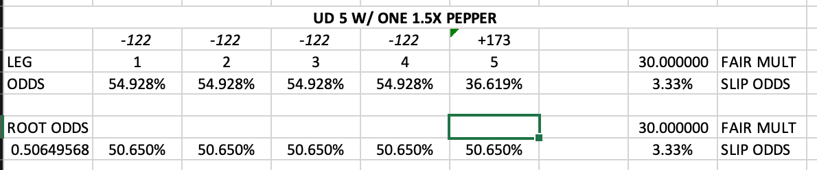 The added wrinkle now is that you cannot assign the “risk” or the “odds” equally across all five legs. Since all five-leg entries consist of opportunity cost (no one is forcing you to use or not use a pepper as your fifth leg, not to mention multiple peppers can be included), the second you assume that the 1.5x leg is “equal” to a 1x leg, you should immediately be discarding all 1x legs.