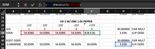 If you must beat 3.33% odds (at 30x payout), and you have four legs of 1x that all hit at an X% rate in total, then we can determine the rate of Y%, or F28 in this screenshot, that the pepper must hit for the slip to be breakeven.