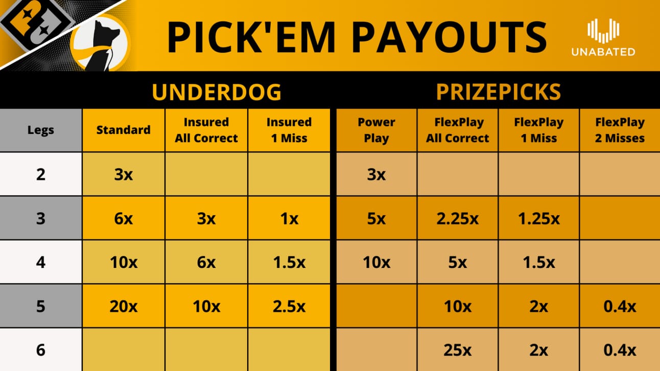 Underdog allows you to create slips featuring between two and five player-specific higher/lower selections, with the catch being you have to get everything right to be paid out. There’s a wonderful breakdown of the odds needed here and here if you are unconvinced that if you are building UD slips, you should be using 5-leg entries almost exclusively. I’ll let you peruse those articles on your own, however, as this math is table stakes at this point.